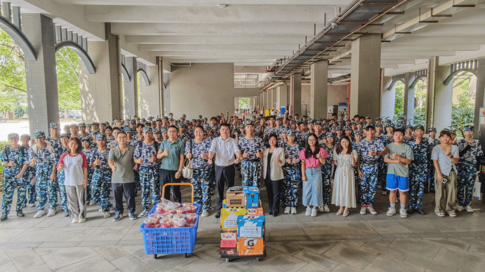 自9月12日起,2025级全体本科新生开始为期半个月的军训。9月18日中午,公共卫生学院党委李羽书记、刘宇珊副书记携学院全体辅导员老师及团学组织主要学生干部前往番禺校区A1栋架空层,代表学院探望慰问正在参训的同学们。