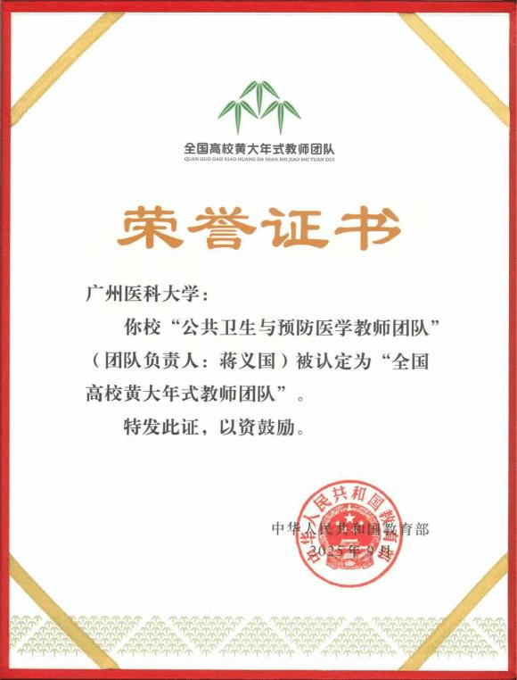 2025年9月,教育部发布了第三批“全国高校黄大年式教师团队”创建示范活动认定名单,我院公共卫生与预防医学教师团队顺利通过认定。本次创建活动全国共有190个高校团队通过验收认定,团队负责人均为来自各个领域的领军学者。