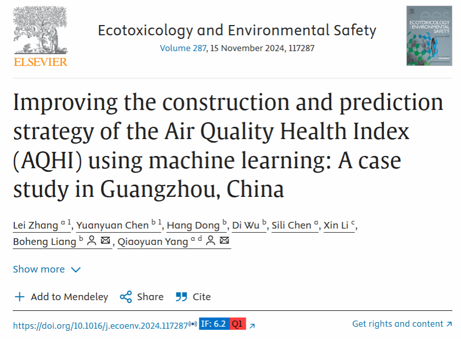 近期,国际环境科学与生态学领域杂志Ecotoxicology and Environmental Safety发表了我院2020级本科生张磊为第一作者的研究论文“Improving the construction and prediction strategy of the Air Quality Health Index (AQHI) using machine learning: A case study in Guangzhou, China”。我院杨巧媛教授和广州市疾病预防控制中心梁伯衡主任医师并列为该论文的通讯作者。Ecotoxicology and Environmental Safety是环境科学与生态学领域的知名期刊,中国科学院期刊分级为环境科学二区Top、毒理学1区期刊。