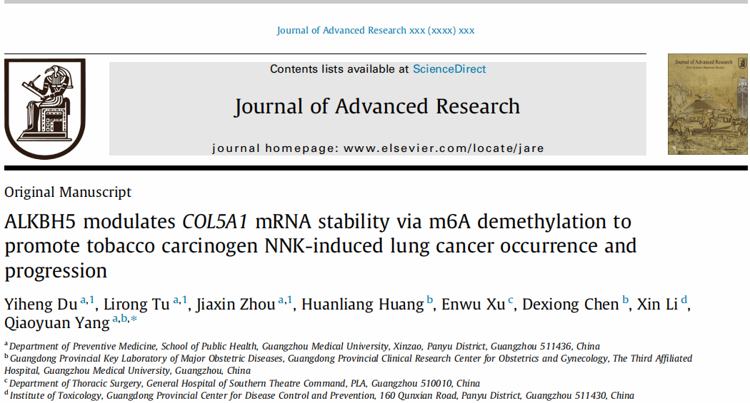 2025年08月12日,公共卫生学院杨巧媛教授团队在Journal of Advanced Research杂志在线发表了题为ALKBH5 modulates COL5A1 mRNA stability via m6A demethylation to promote tobacco carcinogen NNK-induced lung cancer occurrence and progression的研究论文。该研究揭示了烟草特异性致癌物NNK通过诱导m6A表观遗传修饰改变调控COL5A1转录本稳定性,促进肺癌发生和发展的分子机制。公共卫生学院硕士研究生杜一恒、涂立蓉、周加欣为该论文共同第一作者,杨巧媛教授为论文的唯一通讯作者。